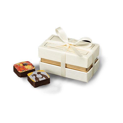 Add a hint of whimsy and decadence to your next special event with this elegant creme and gold box that opens to reveal two pieces of signature MarieBelle New York ganache. Beautifully showcasing our favorite year-round designs, each is crafted from the finest ingredients and all-natural flavors like Passion Fruit, Lavender, and Pistachio, making them as delicious to devour as they are to admire. Both tiny and charming, these MarieBelle New York favors can also serve as delicious placeholders or party favor to cherish after a special day.