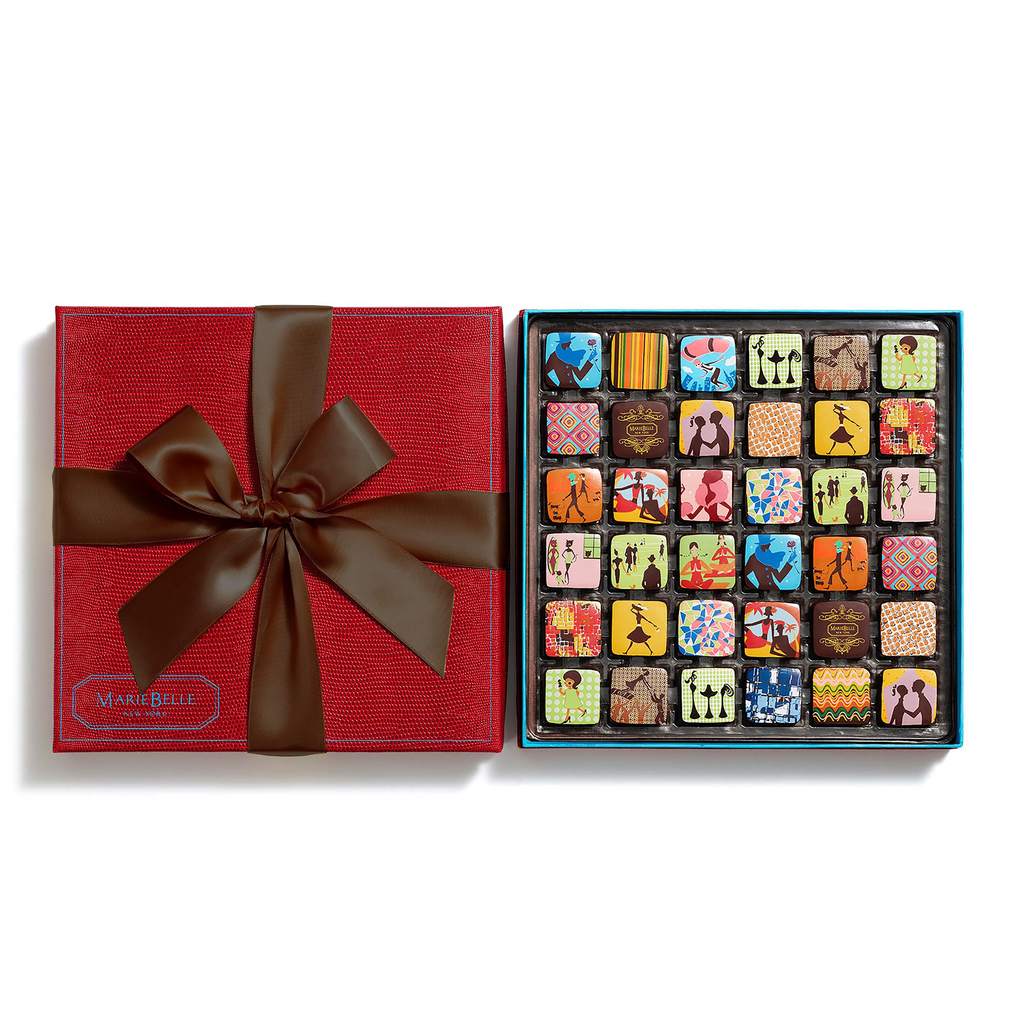 Thirty-six signature MarieBelle New York chocolate ganaches artfully arranged in an elegant red box. Each ganache combines the finest single-origin chocolate with eclectic ingredients and artisanal techniques. A delicious jewel box that showcases each of MarieBelle's delicious ganache flavors.