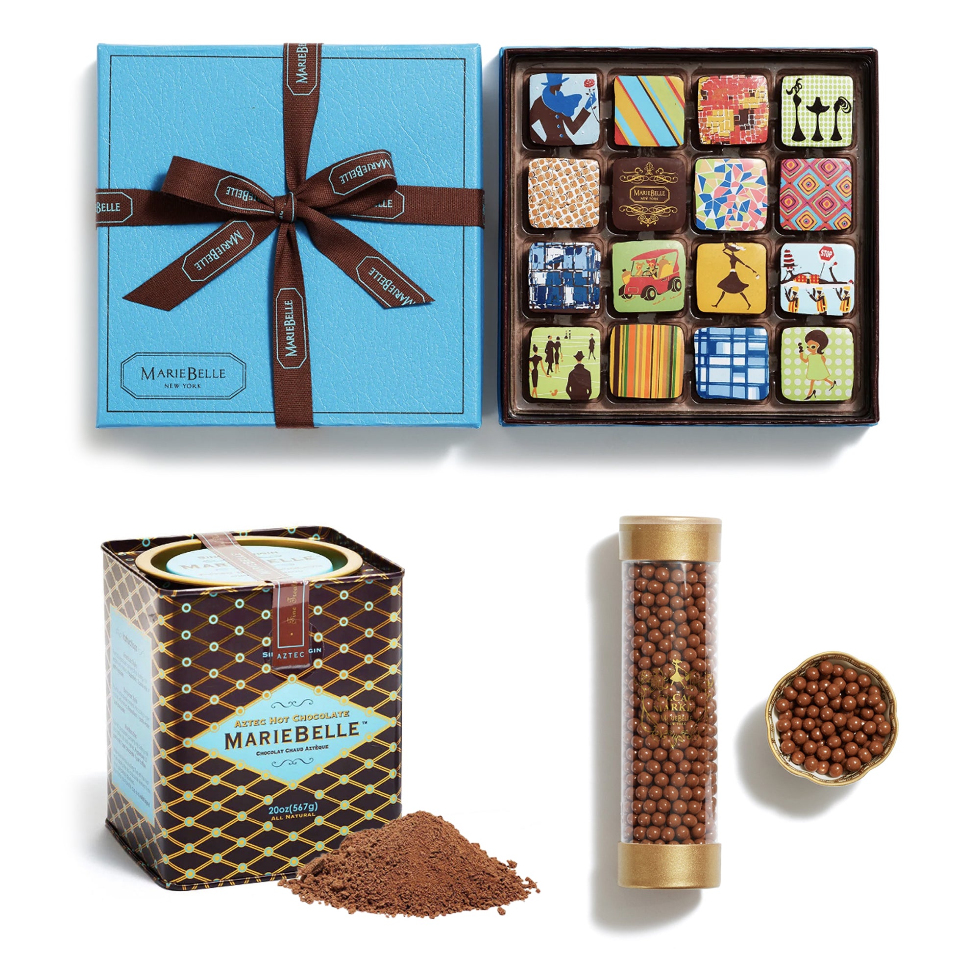 This handsome package includes a 10oz tin of our signature Aztec Hot Chocolate, a signature box of our 16pc mouthwatering chocolate ganache, and a cylinder of bite-sized Milk Chocolate Pearls.