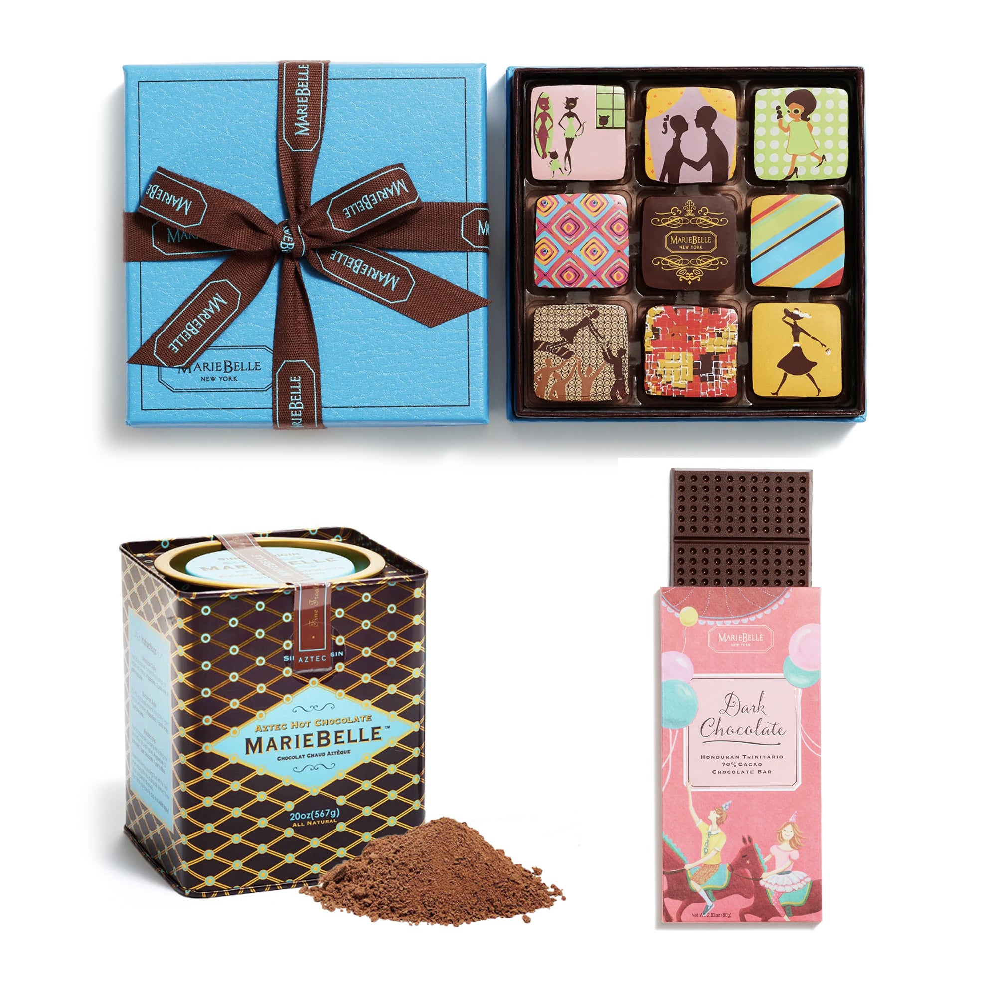 This handsome package includes a 10oz tin of our signature Aztec Hot Chocolate, a signature box of our 9pc mouthwatering chocolate ganache, and an 80gr MarieBelle New York Dark Chocolate bar.