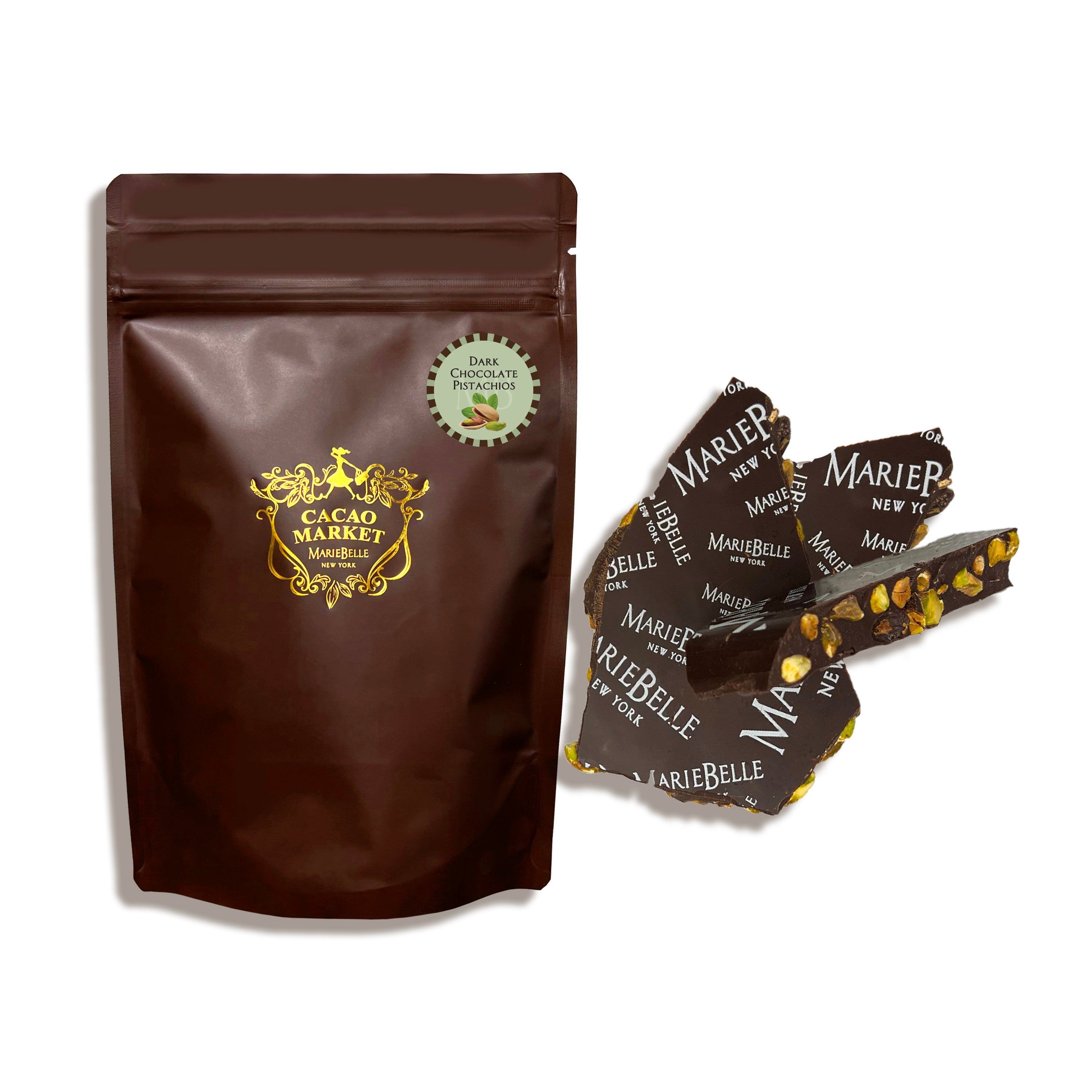 Repackaged in Cacao Market resealable bags, each bag comes with 200g chocolate bark that is made with the finest ingredients and chocolates by our chefs in New York. This product in particular is made with 70% dark chocolate and irresistibly crunchy pistachios, be ready to go nuts for chocolate!