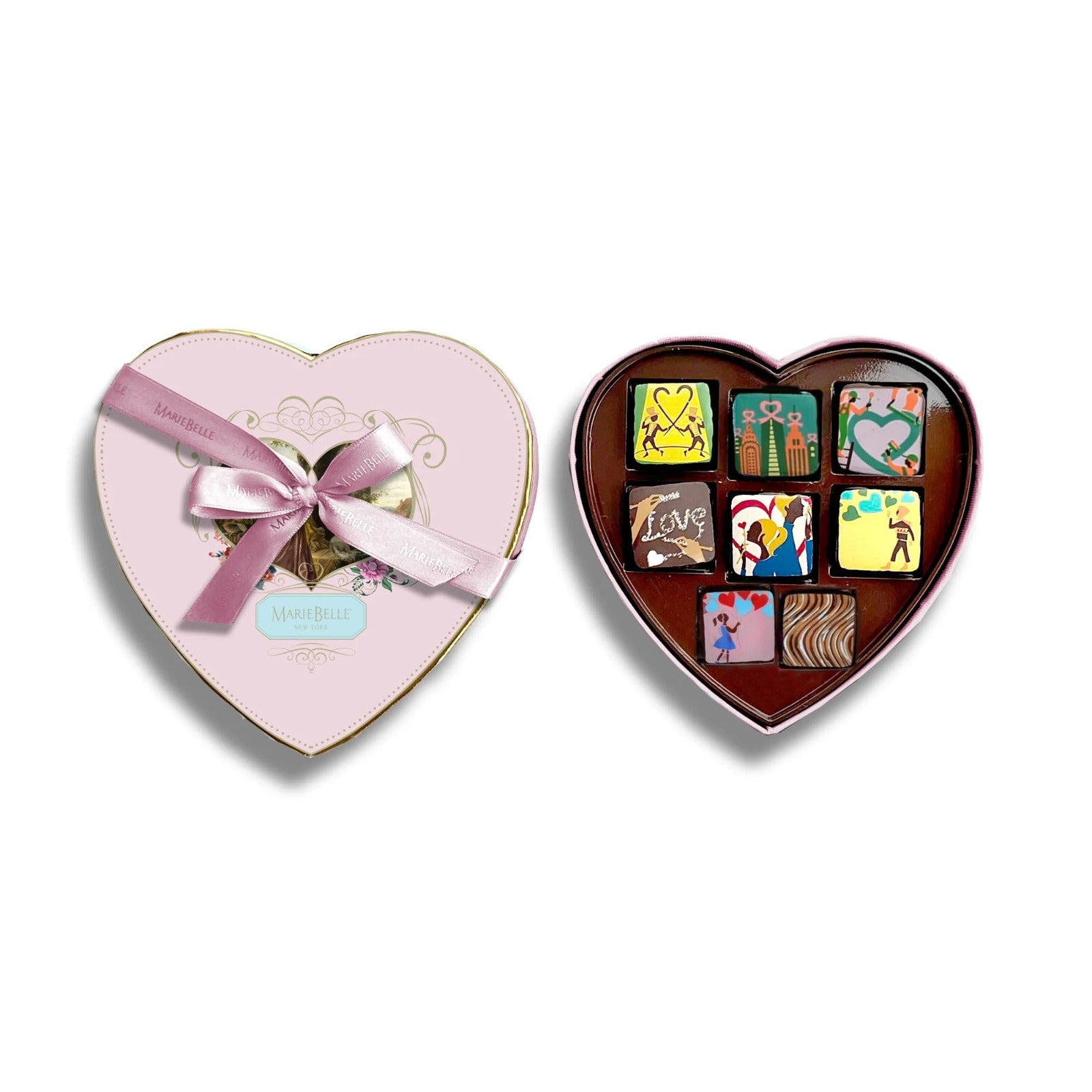 Celebrate the most romantic day of the year with this beautiful box of mouth-watering chocolate from MarieBelle New York’s limited edition Valentine’s Day Collection. Elegantly presented in a whimsical heart-shaped box featuring a young couple passionately in love and trimmed with accents of gold, it holds handmade chocolate ganaches, completed with a single red chocolate heart evoking all things sweet and passionate.